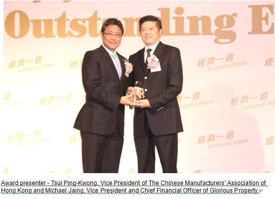 On 5 Dec 2011, the 8th Hong Kong Outstanding Enterprise Parade organized by the <<Economic Digest>> was successfully held at the Conrad Hotel Hong Kong. This award aimed to commend some outstanding enterprises from all listed companies in Hong Kong. Glorious Property was awarded as Hong Kong Outstanding Enterprise for the first time based on our dedication in enhancing our professional standard and quality in management. Our capability was highly recognized in the industry.